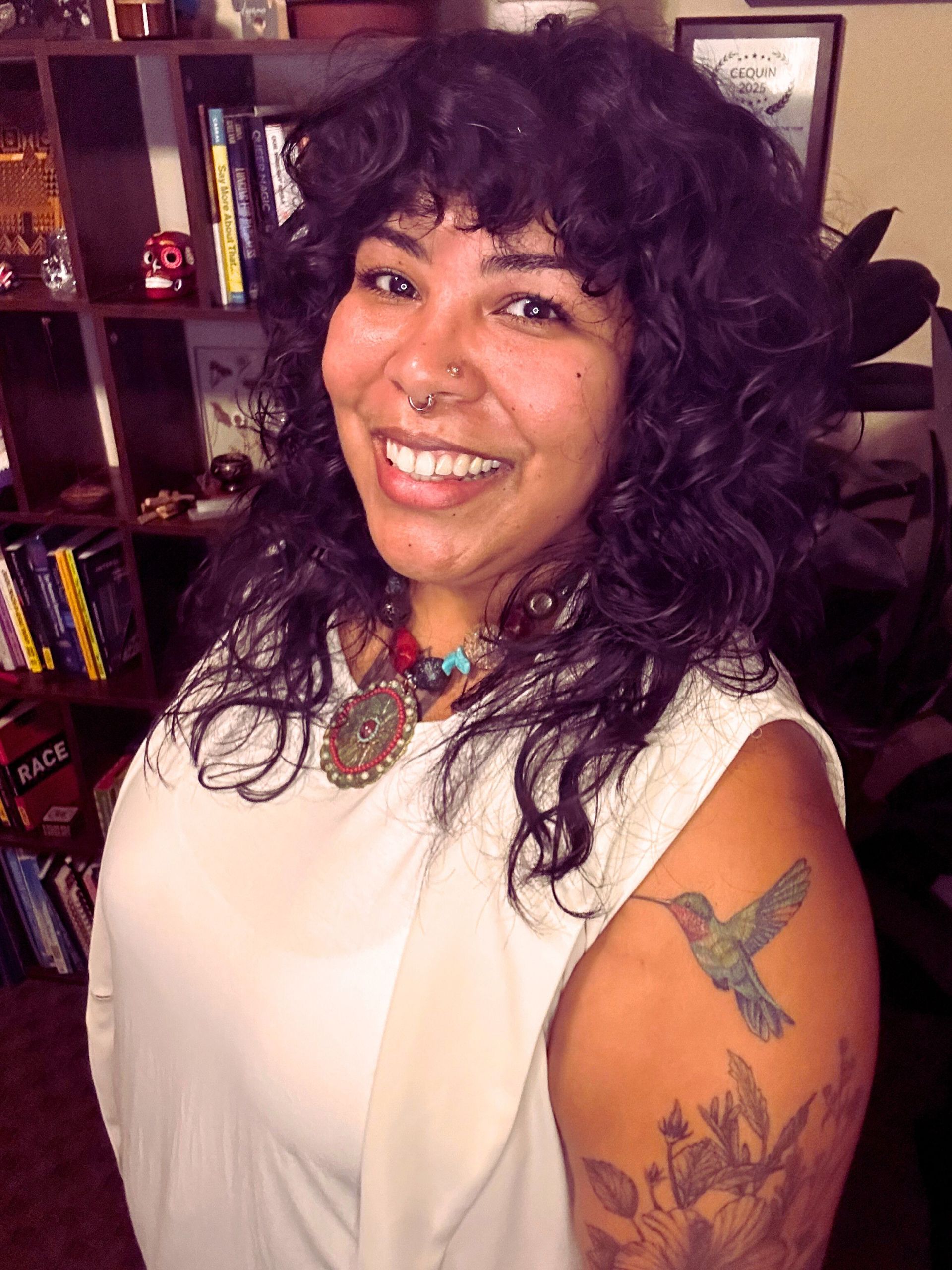 I am a child of [un]documented immigrants from Nicānāhuac and Quisqueya—a Queer Afro-Latine, non-binary femme, disabled person shaped by lineages of wise people, healers who have transmuted pain and survival into medicine throughout their continued displacement at the hands of colonial powers. Soy hije de inmigrantes [in]documentades de Nicānāhuac y Quisqueya—una persona Afro-Latine, queer, no binarie, y discapacitada, formade por linajes de sabiduría y sanación. Desciendo de personas sabias y de sanadores que han sabido transmutar el dolor y la supervivencia en medicina, incluso en medio del desplazamiento continuo impuesto por los poderes coloniales.I come from ancestors—living and dead—who braided Indigenous and African traditions into Catholicism not to forget them, but to protect them, carrying forward what needed to survive.